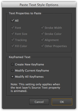When pasting text styles to layers with keyframed Source Text, you can choose to create a new keyframe, modify the current keyframe, or modify all keyframes.